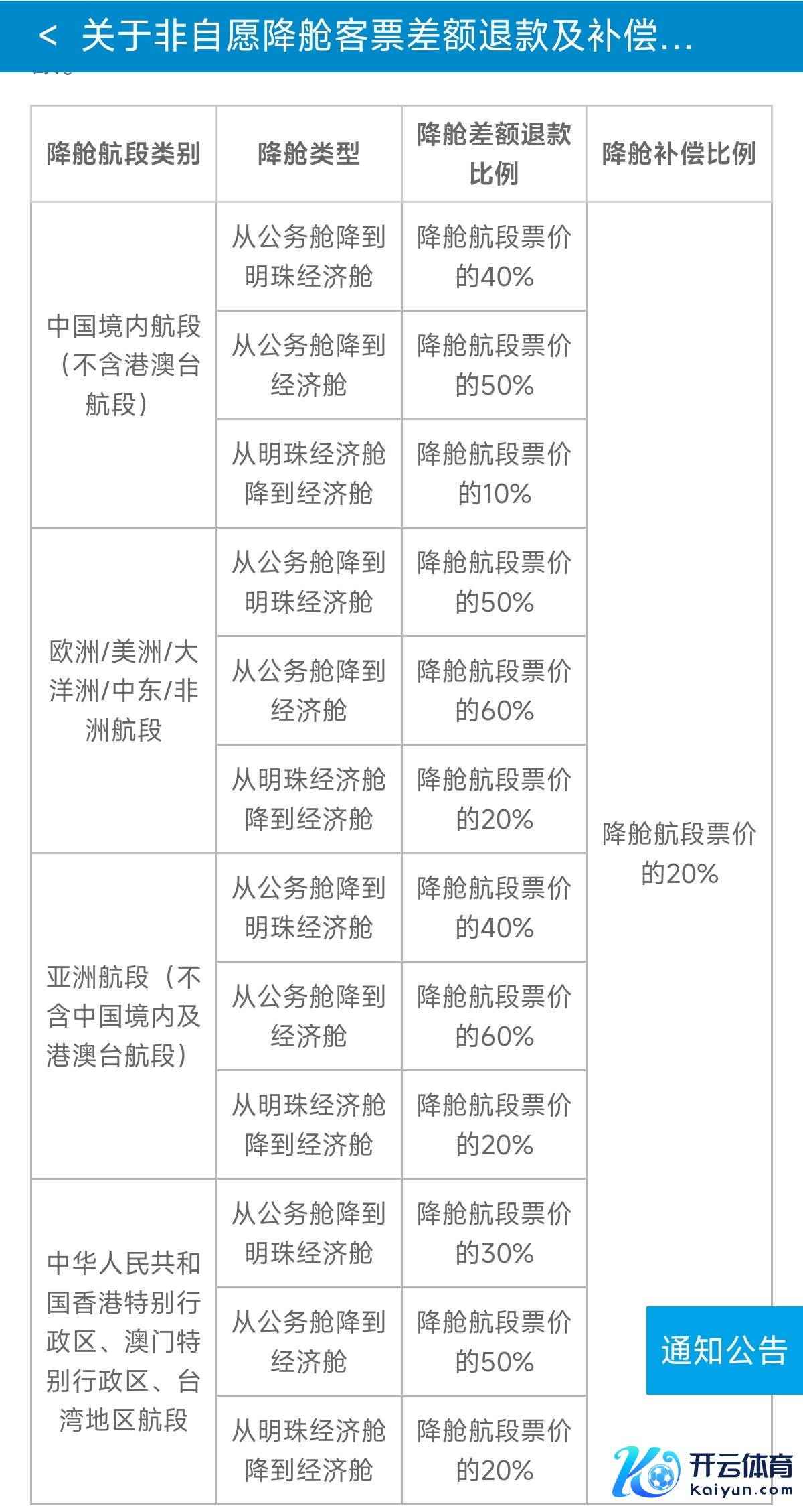 也有航司是基于一定比例进行补偿。如南航,从公事舱降到经济舱的补偿比例为“降舱航段票价的20%”。