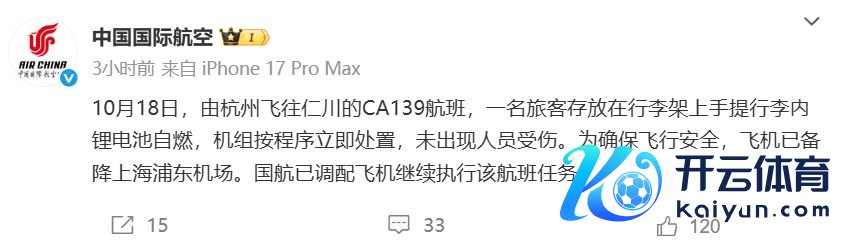10月18日,@中国海外航空 通报:由杭州飞往仁川的CA139航班,又名搭客存放在行李架上手提行李内锂电板自燃,机组按秩序立即处罚,未出现东谈主员受伤。为确保飞行安全,飞机已备降上海浦东机场。国航已调配飞机连接施行该航班任务。