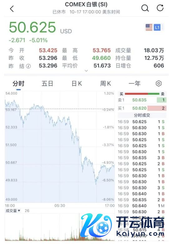 为止收盘,COMEX白银期货跌超5%,报50.63好意思元/盎司。